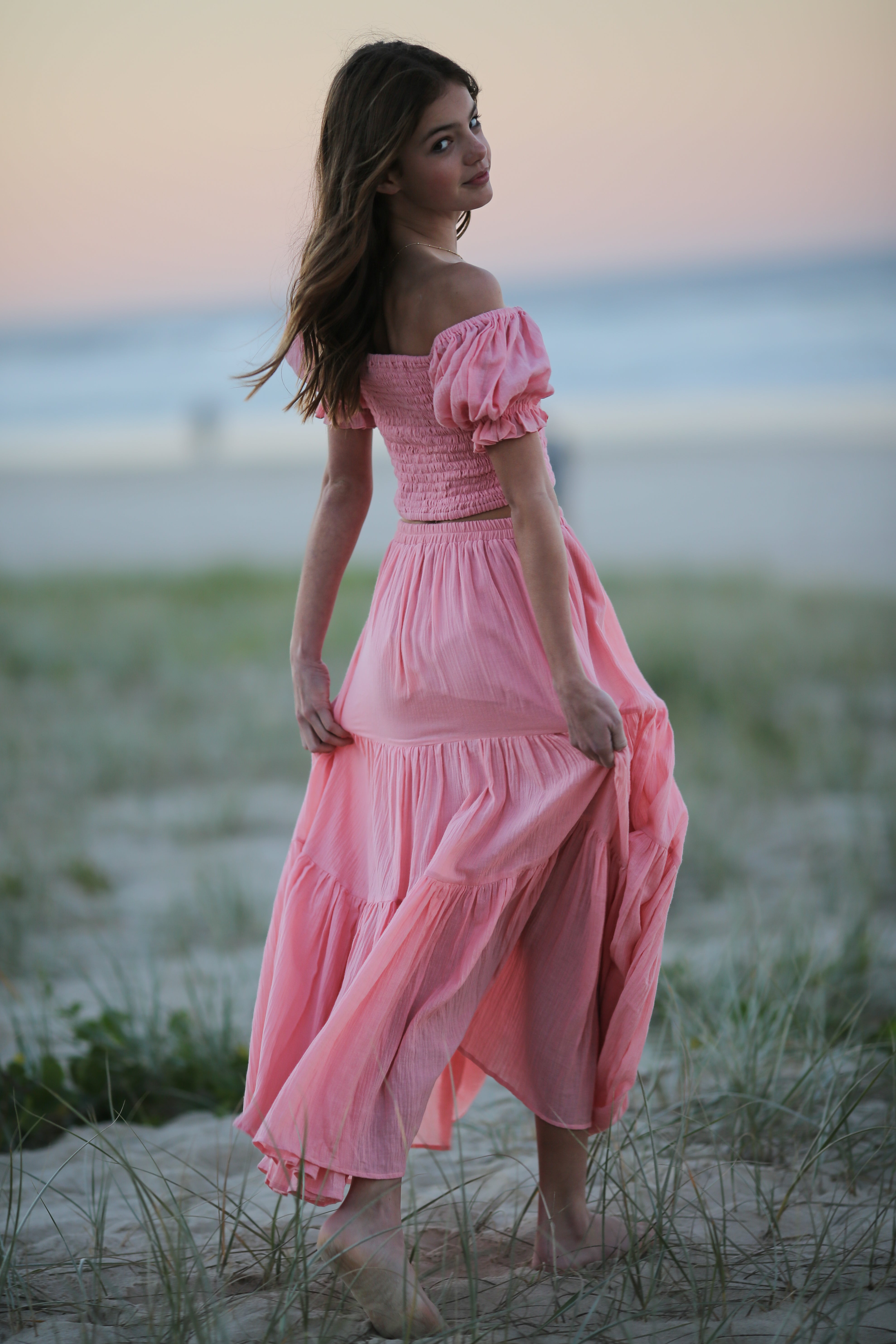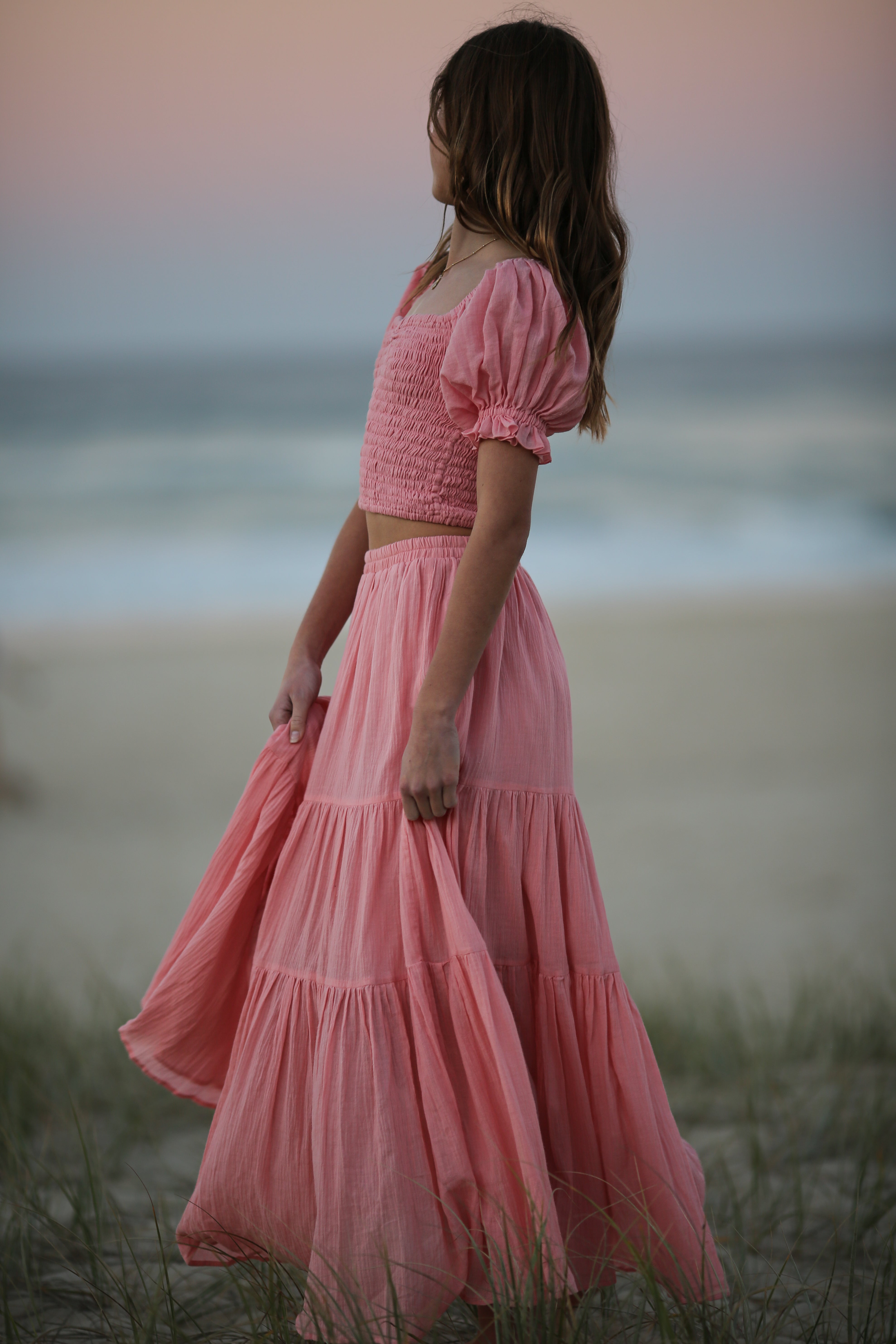 Crafted from lightweight cotton, the set features a layered skirt in a new pink colourway and a matching elastic-shirred top with a sweetheart neckline and puff sleeves that can be worn on or off the shoulder.