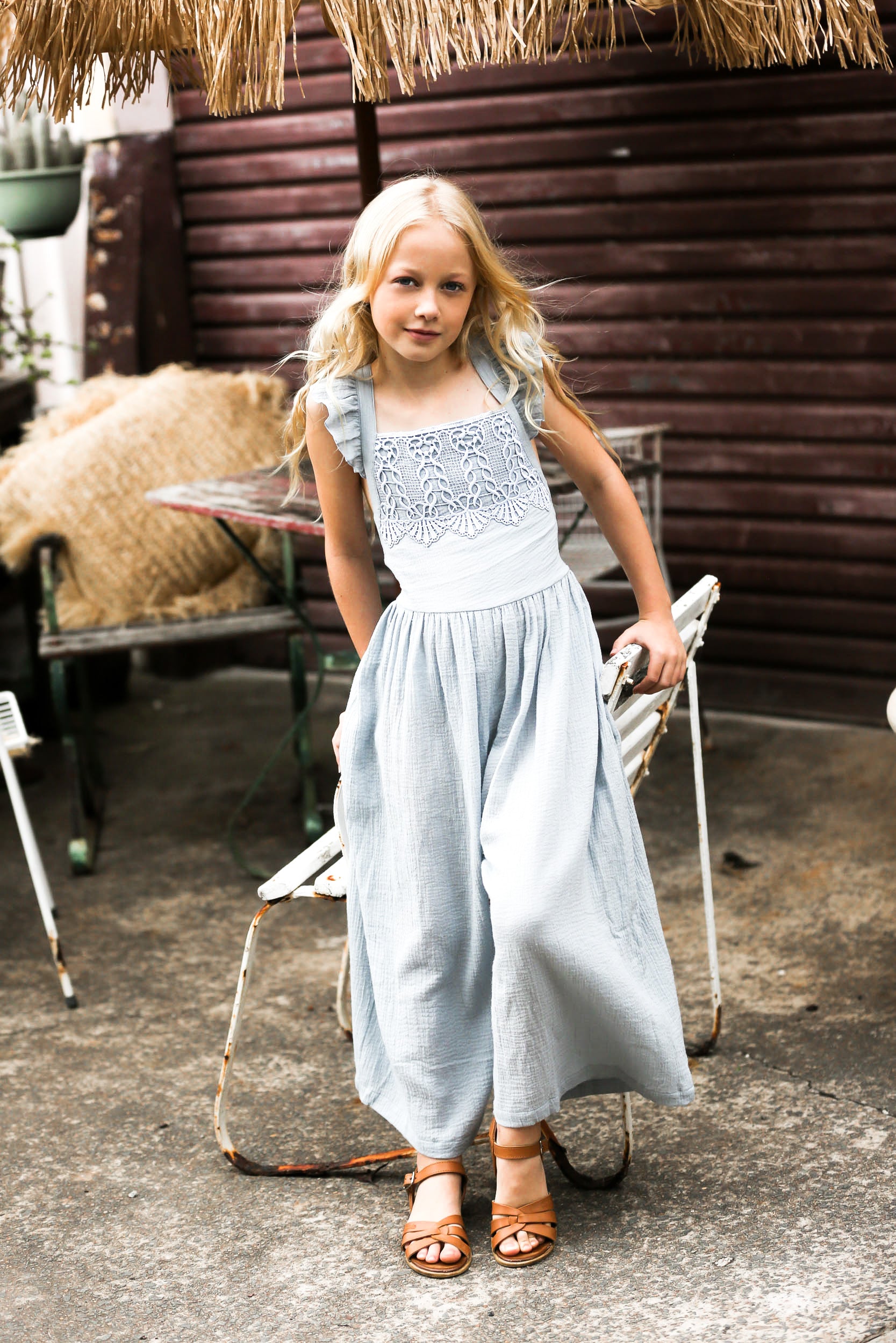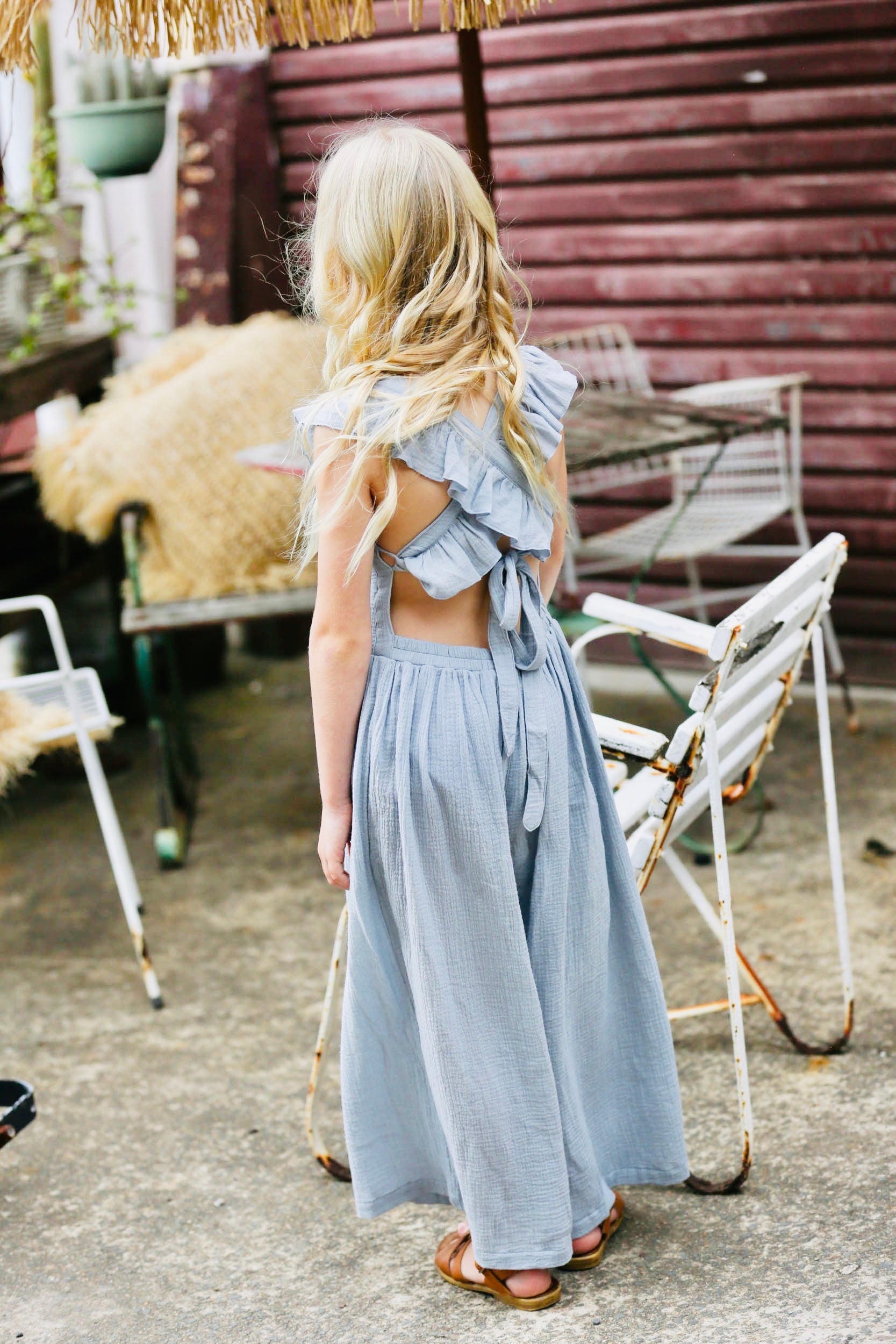 The Iris jumpsuit is made from a dusty blue cotton crinkle cheesecloth fabric.