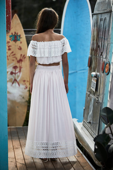 The top features an offwhite ruffled lace in an off the shoulder design.