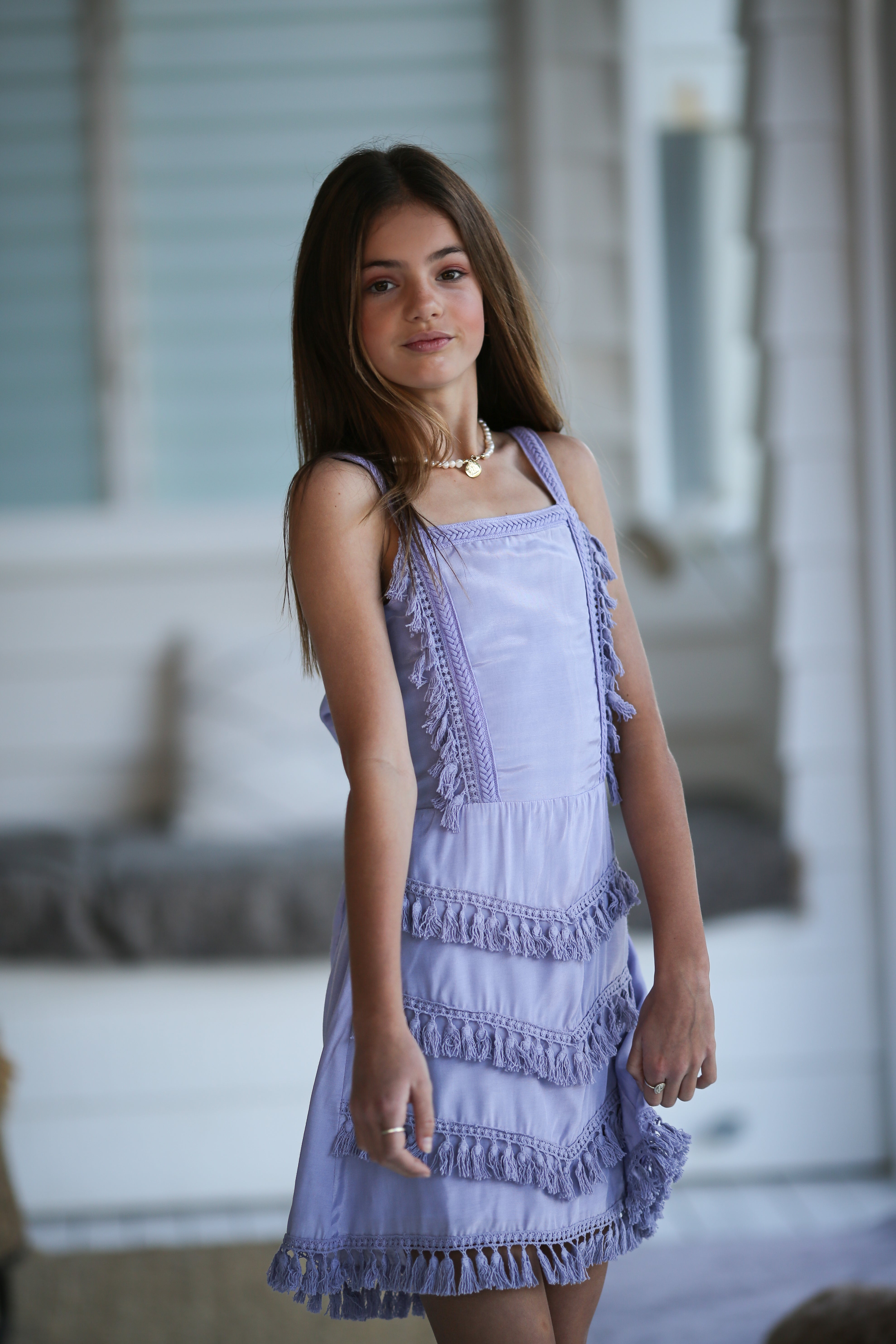 The Juno Mini Dress – Lavender is crafted from a stunning silky fabric in a soft pastel lavender hue. This elegant design features a tassel-trimmed skirt and bodice, finished with a sash tie at the back for a timeless Tea Princess touch.
