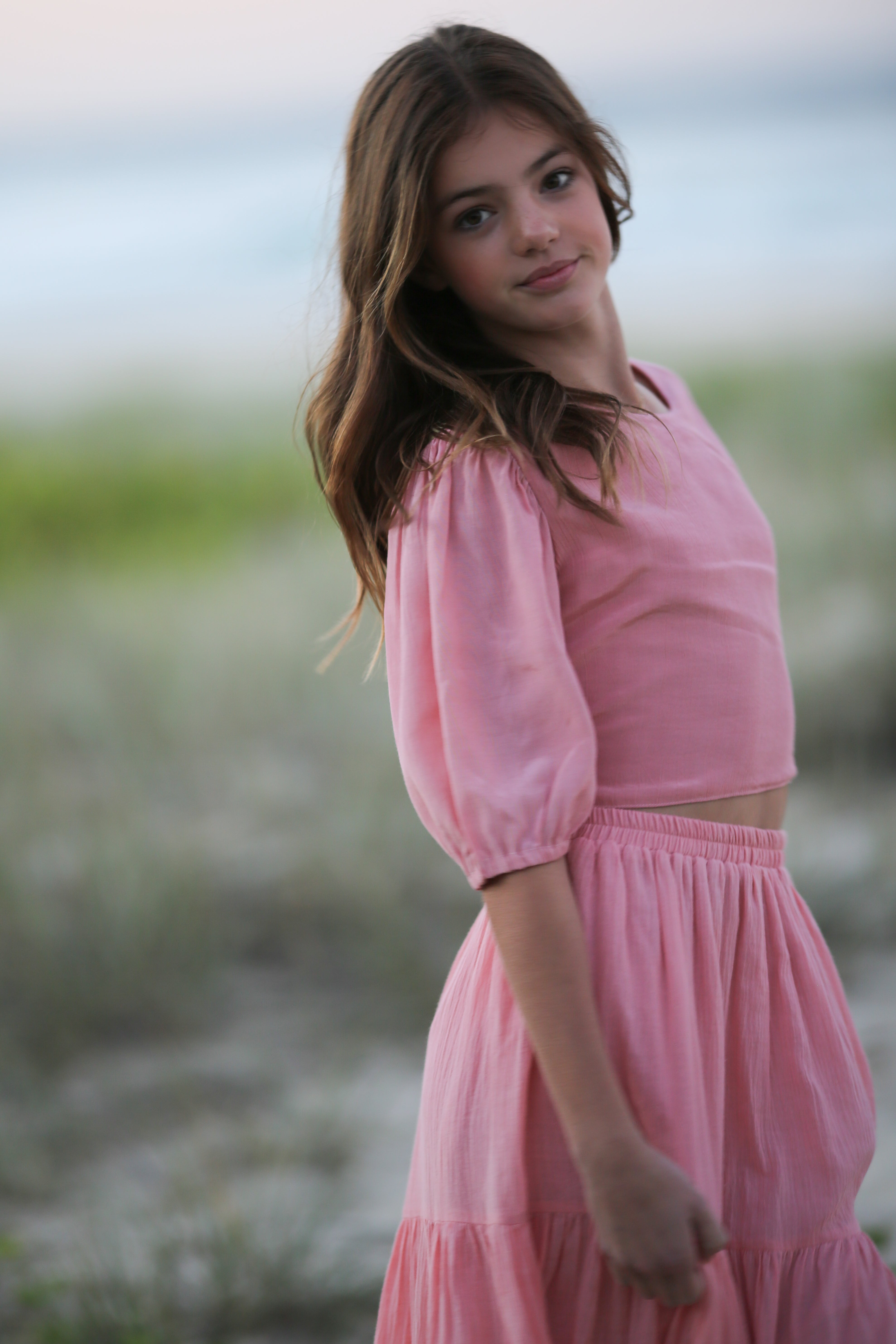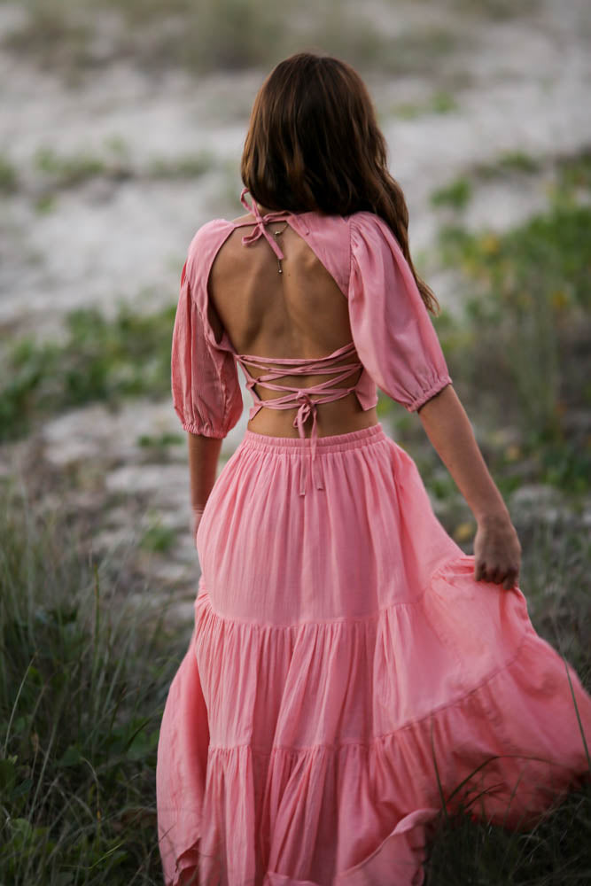 The Monet top is made from a soft, satin-feel fabric and features elegant puff sleeves and an open lace-up back. Please note the top and skirt are made from different fabrics, resulting in a subtle variation in tone between the two pieces.